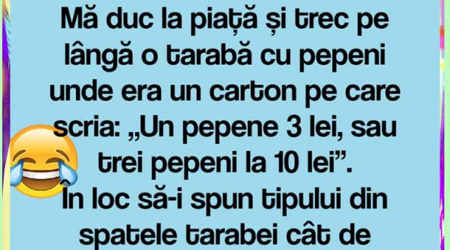 Mă duc la piaţă şi trec pe lângă o tarabă cu pepeni unde era un carton pe care scria: „Un pepene 3 lei, sau trei pepeni la 10 lei”.